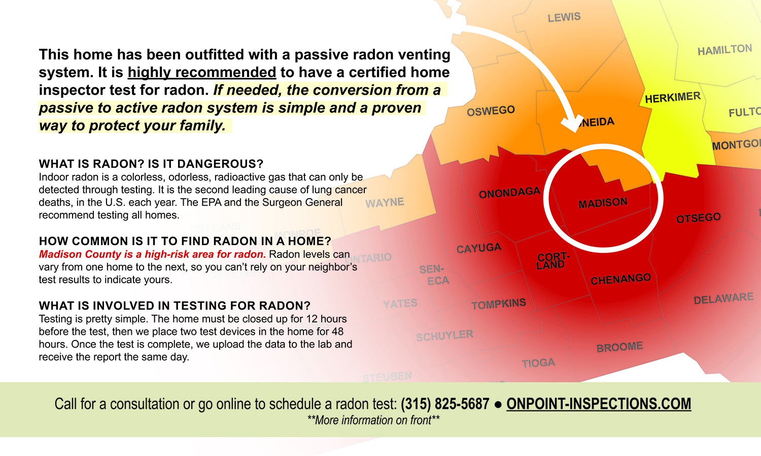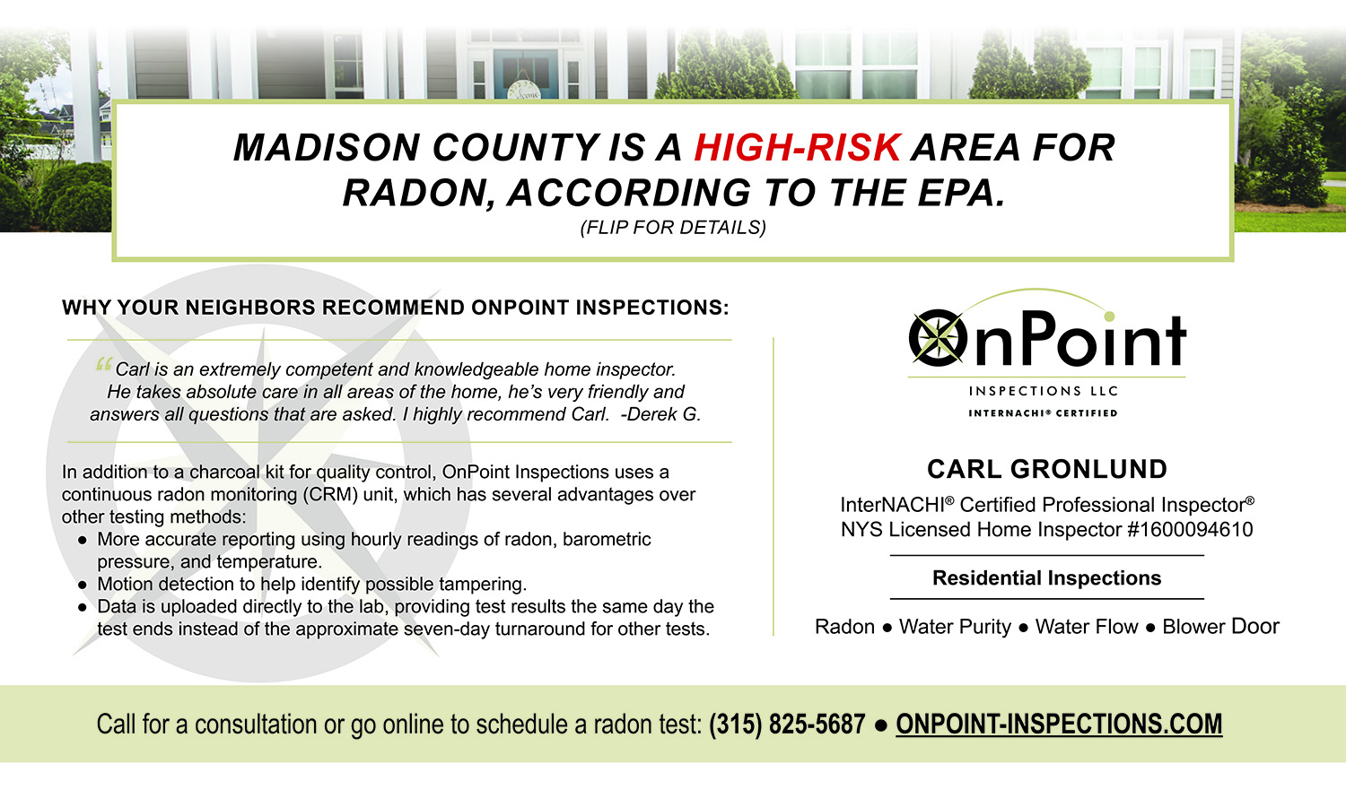 A local home inspector, Carl, was looking for print collateral to leave inside newly constructed houses educating the new homeowners of the dangers of radon and encouraging them to consider hiring Carl for testing.